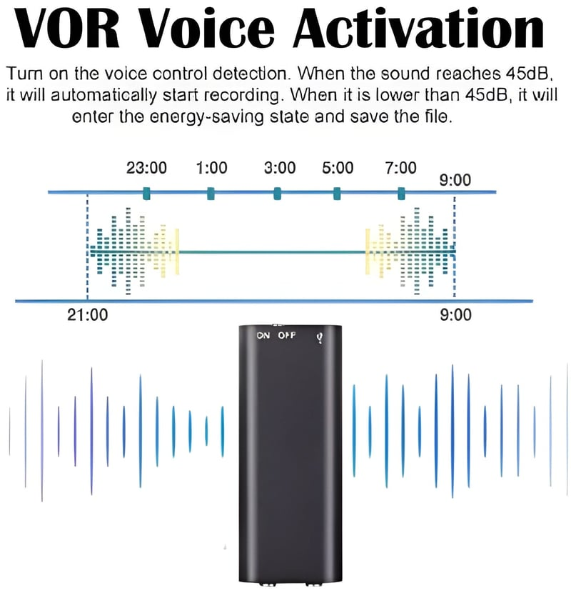 🔊VOR Voice Activation: Automatically initiate recording when sound levels reach 45dB. The VOR feature conserves battery by switching to energy-saving mode when sound levels drop.